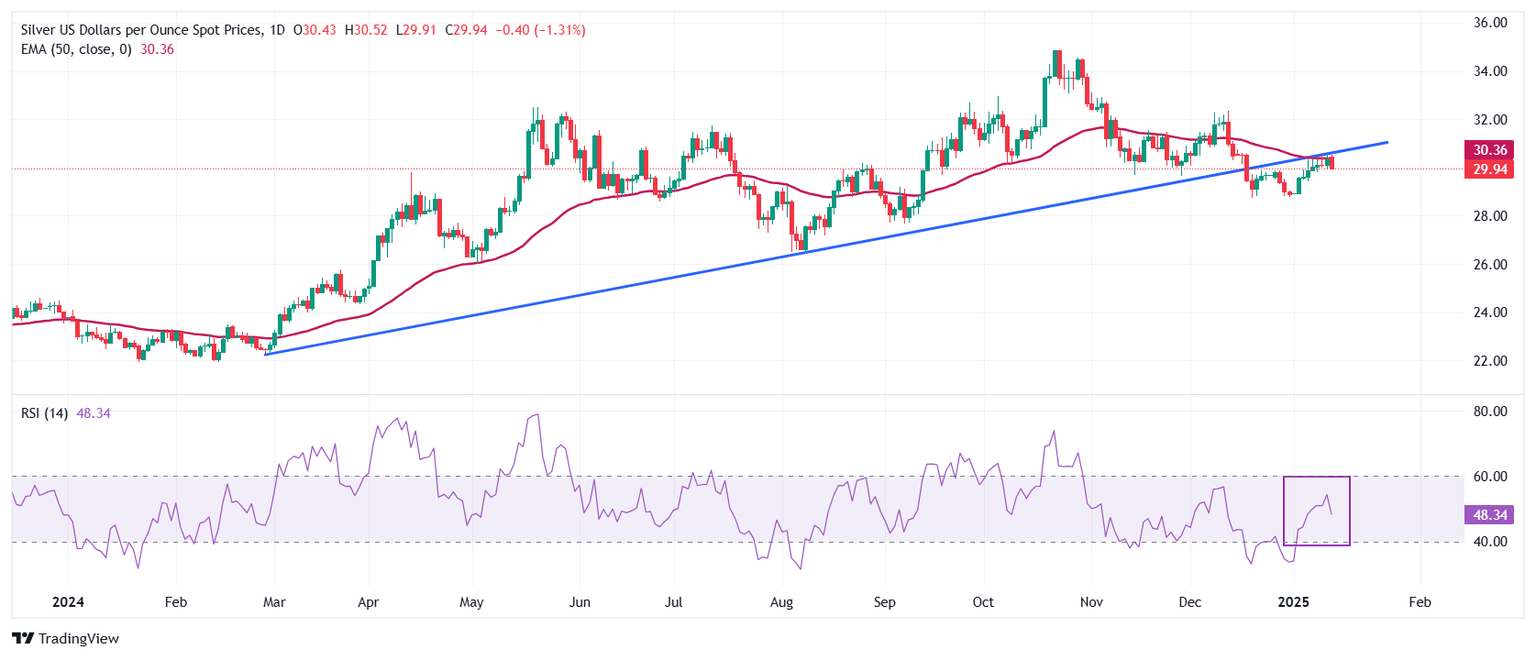 Silver price continues to face selling pressure near the 50-day Exponential Moving Average (EMA), which trades near $30.35. The white metal remains below the upward-sloping trendline around $30.50 on a daily timeframe, which is plotted from the February 29 low of $22.30
