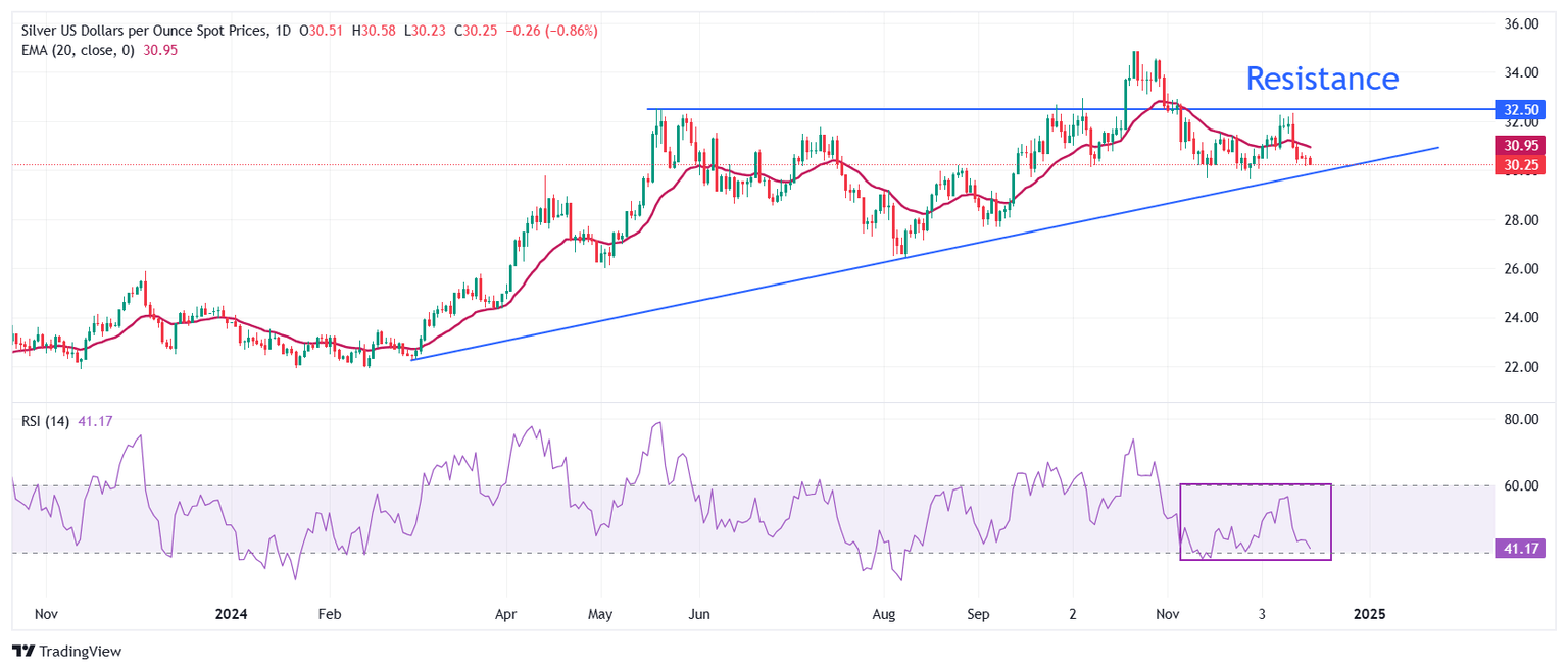 Silver price slides to a fresh two-week low near $30.20 on Wednesday. The white metal weakens after breaking below the 20-day Exponential Moving Average (EMA), which trades around $30.95.