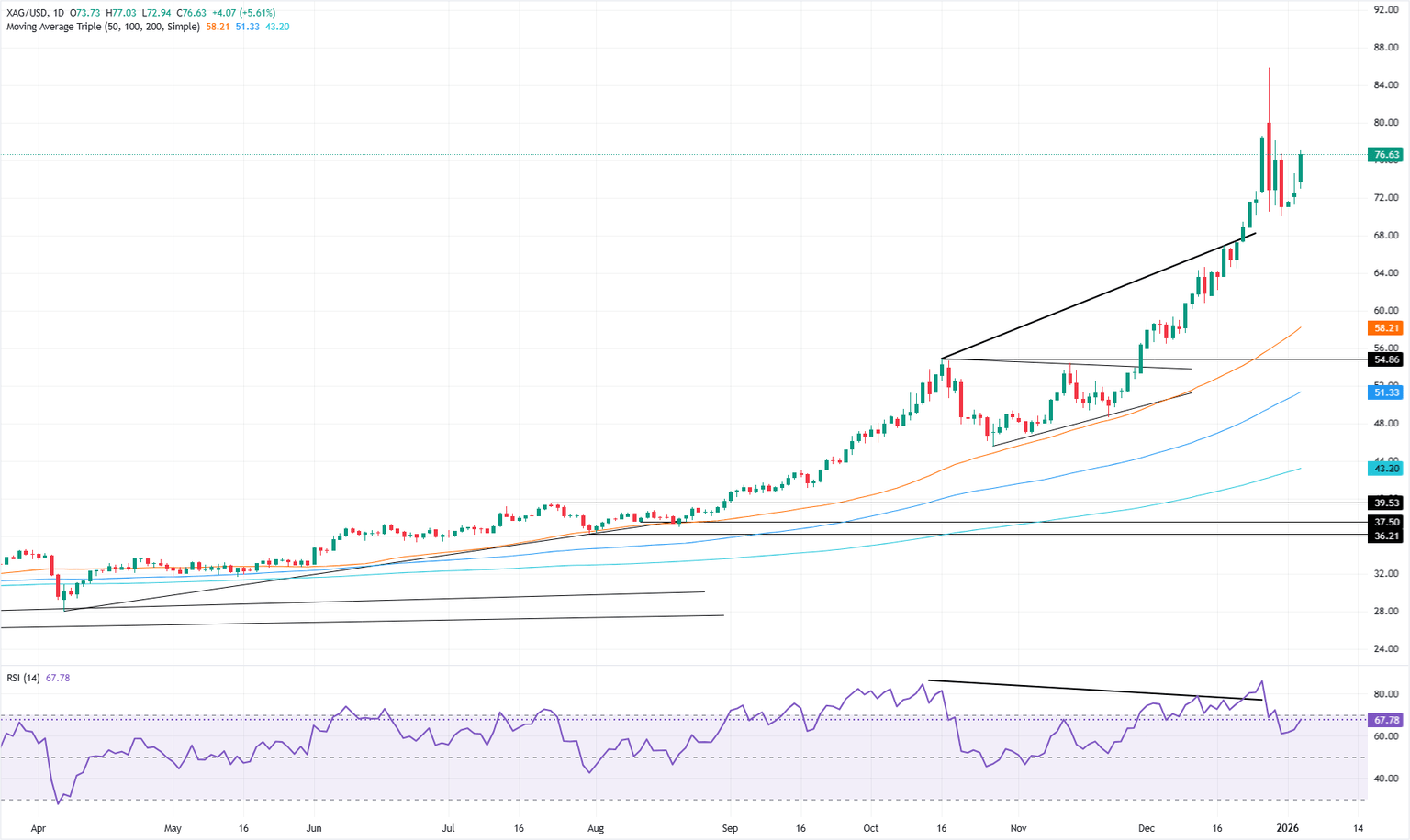 Silver extends its rally on Monday, registering stellar gains of more than 4% following geopolitical events over the weekend, which featured the ousting of the President of Venezuela Nicolas Maduro, captured by US elite forces on Saturday. At the time of writing, XAG/USD trades at $75.91 a troy ounce.