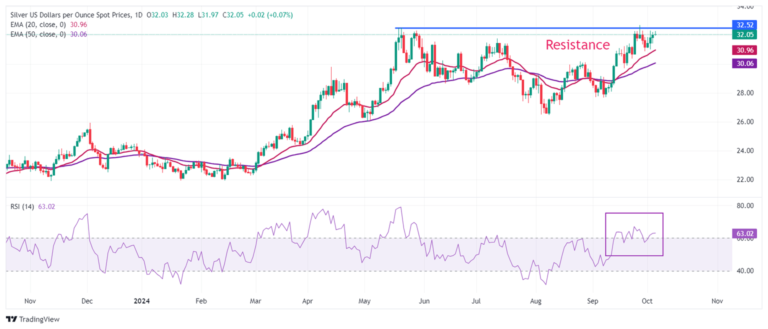 Silver price trades close to near the horizontal resistance plotted from May 20 high of $32.50 on a daily timeframe. The white metal strives for more upside as the outlook is upbeat due to upward-sloping 20 and 50-day Exponential Moving Averages (EMAs), which trade around $31.00 and $30.00, respectively.