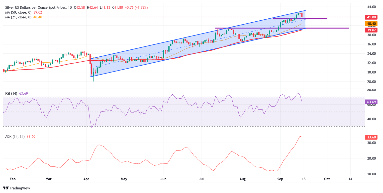 The white metal hit a fresh 14-year high of $42.97 on Tuesday before retreating, pressured by profit-taking and a steadier US Dollar (USD). At the time of writing, XAG/USD trades around $41.90, down nearly 1.70% on the day, with markets squarely focused on the Fed’s first expected rate cut of 2025.