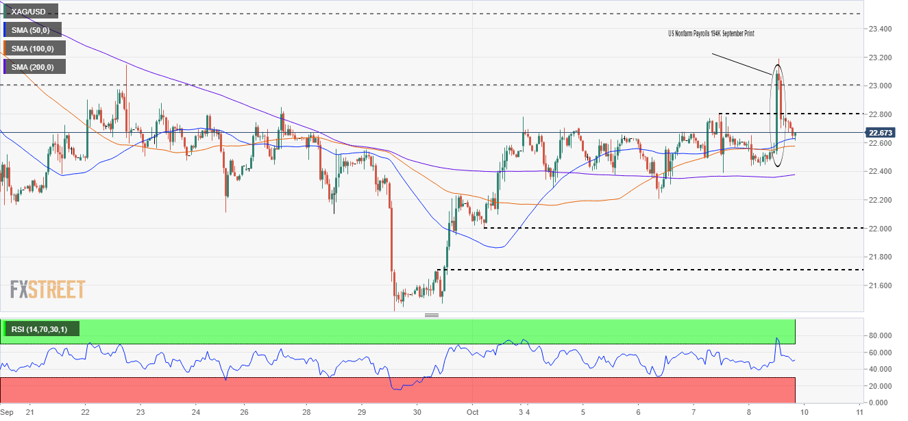 The price action once the Nonfarm Payrolls figure for September hit the wires, silver jumped aggressively towards the new daily high around $23.19, but as the report was dissected, the knee-jerk reaction faded, retreating towards familiar levels around the 50-SMA at $22.63
