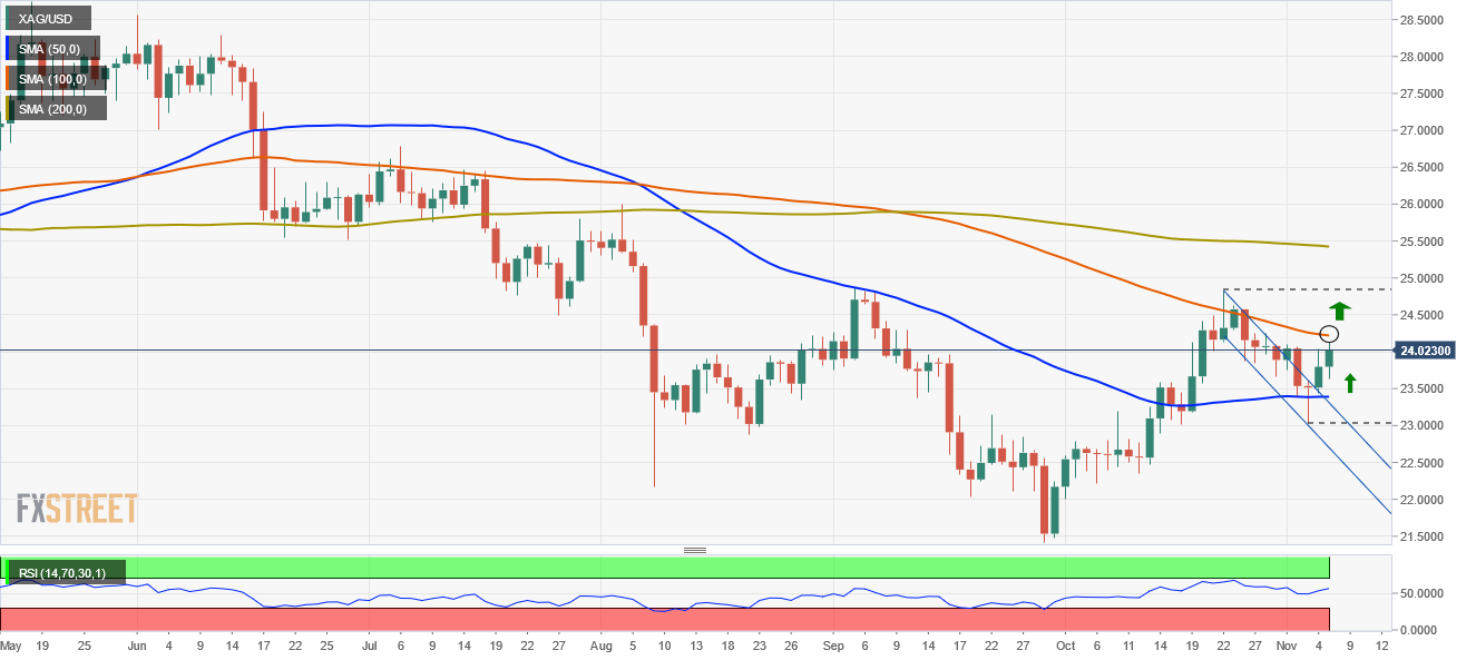 - XAG/USD: A daily close above the 100-DMA opens the door for $25.00; otherwise, it could fall to $23.00.