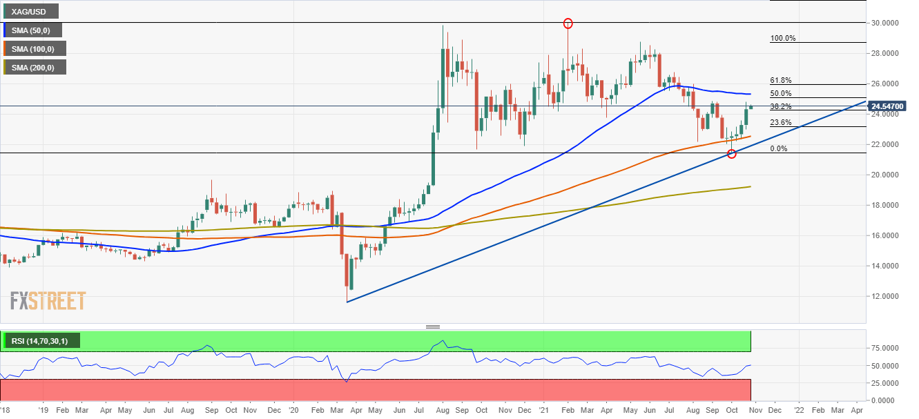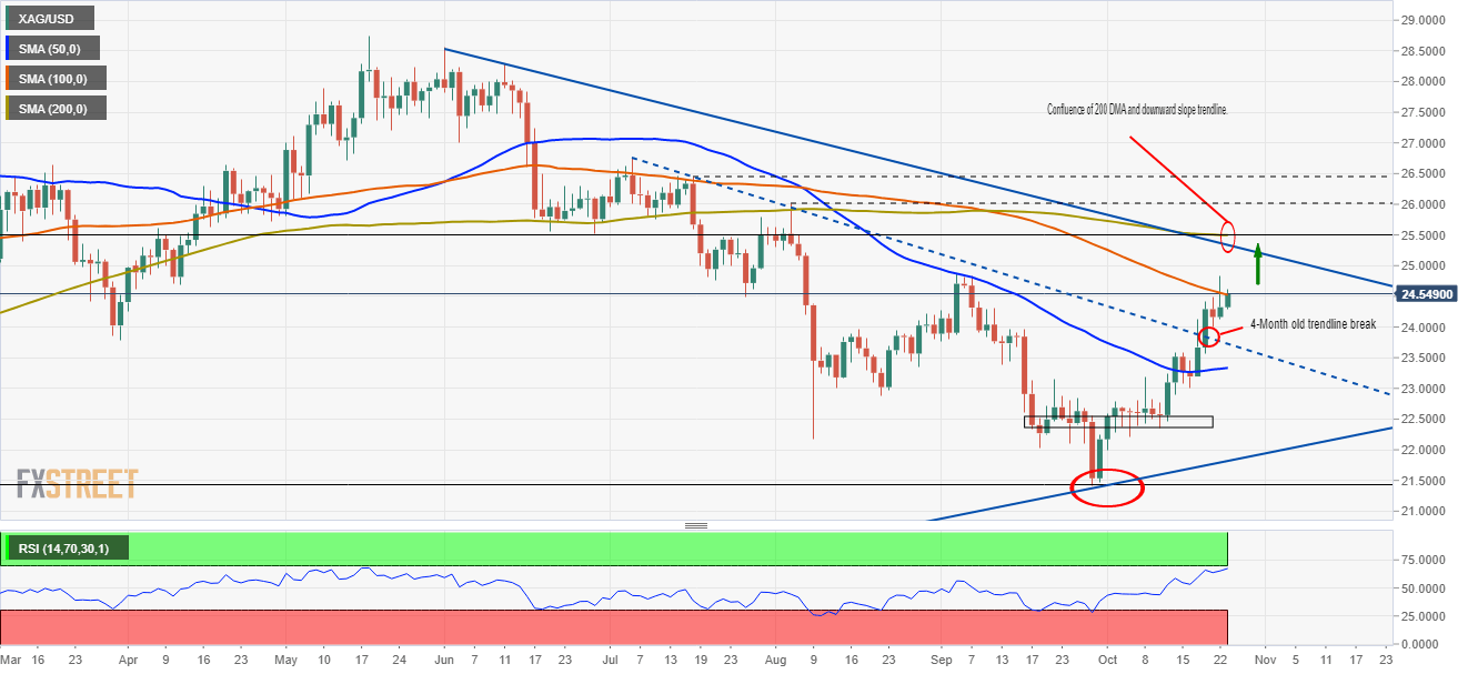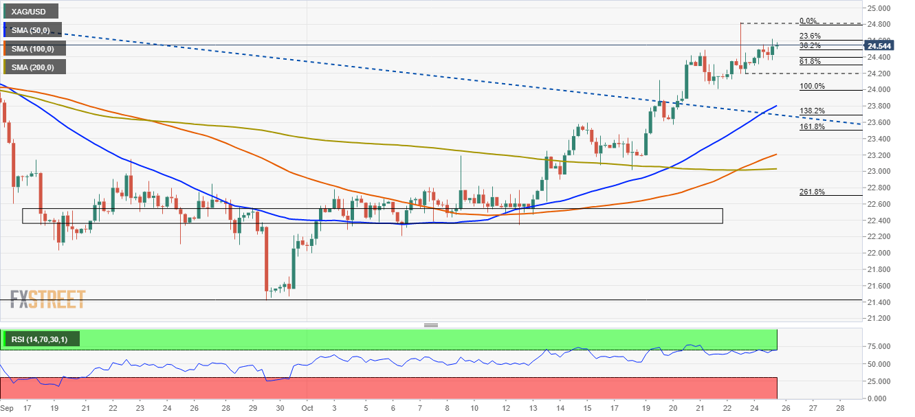 XAG/USD buyers will need a daily close above the 100-day moving average (DMA) at $24.52 to gain further upward strength.