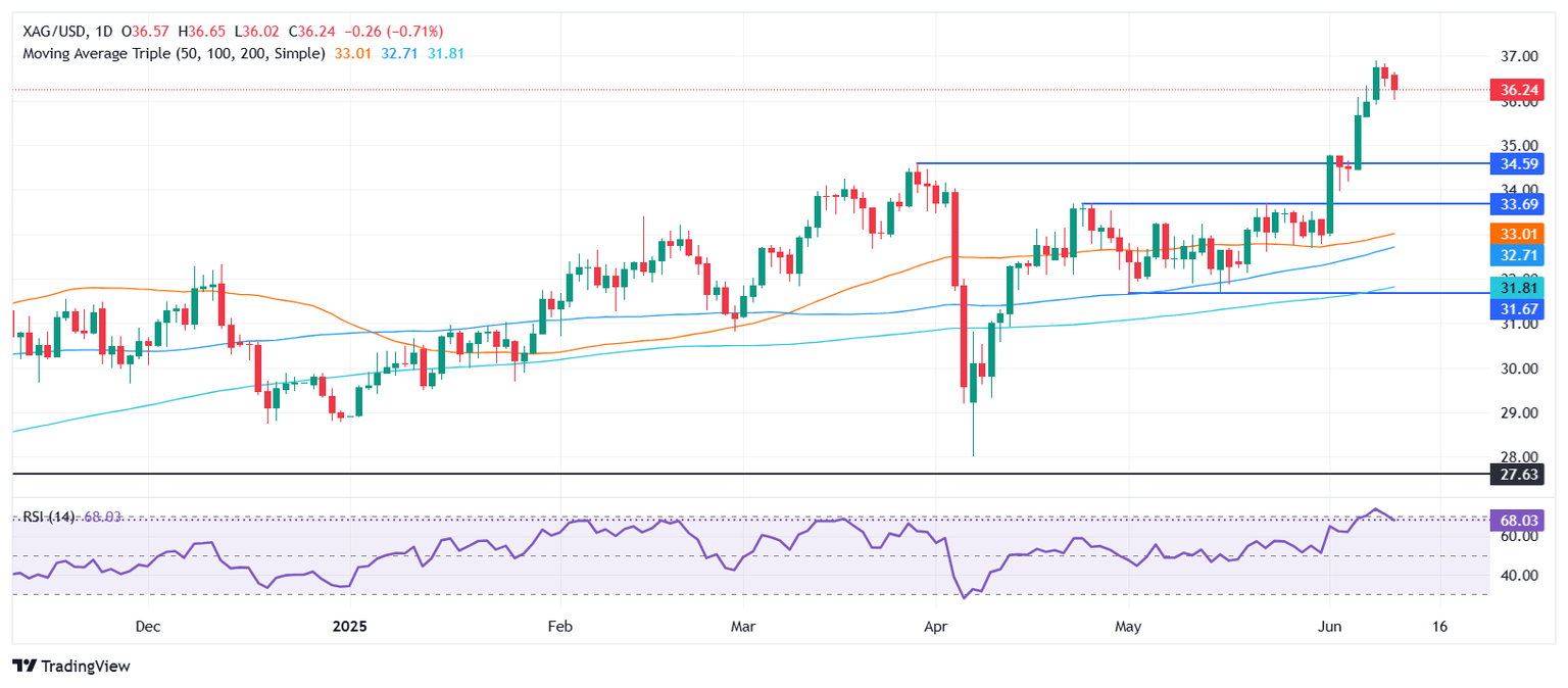 Silver price reverses course on Wednesday as the North American session ends, edging down 0.87%. Although US inflation eased in May, typically a signal that would support rate cuts by the Federal Reserve (Fed) and weigh on the US Dollar, it failed to underpin the grey metal. XAG/USD is trading at $36.21.