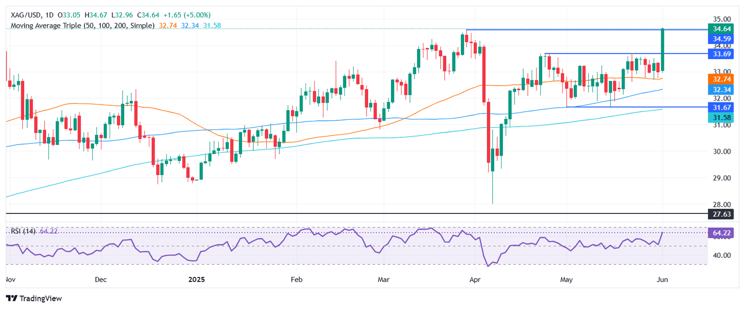 Silver prices soar, gaining over 5% on Monday, as investors who had become risk-averse earlier pushed the grey metal higher. However, as market sentiment improved, buyers continued to drive XAG/USD higher, trading at $34.65 near year-to-date (YTD) highs.