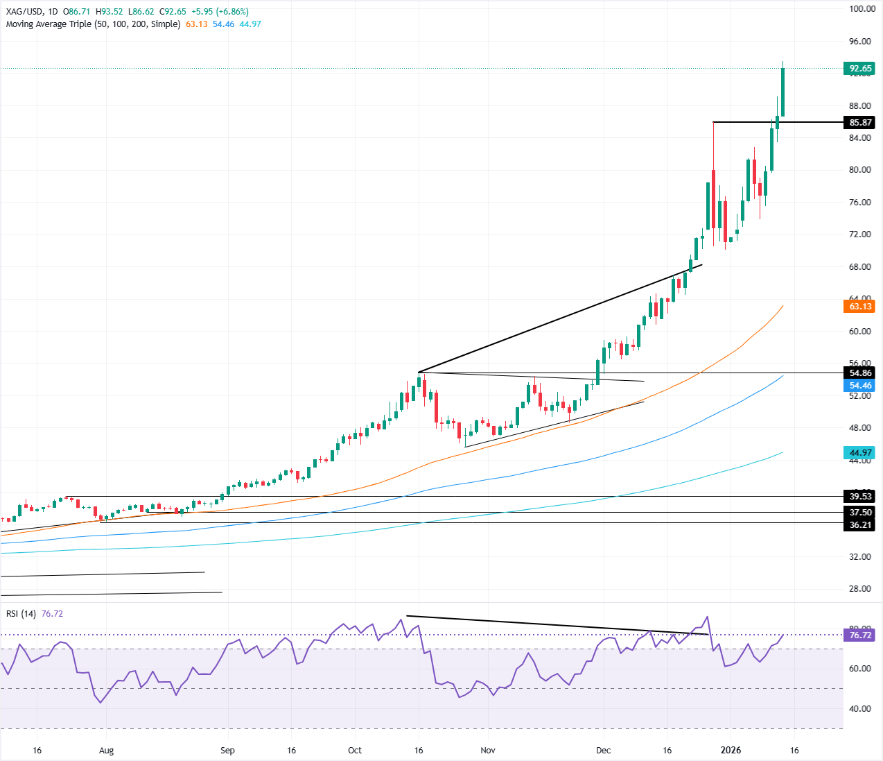 Silver prices skyrocketed to a new record high on Wednesday after bouncing off a daily low of $86.91, hitting a new all-time high at $93.52, and it seems poised to clear the $100.00 barrier in the near term. At the time of writing, XAG/USD trades at $93.05, soaring over 7%.