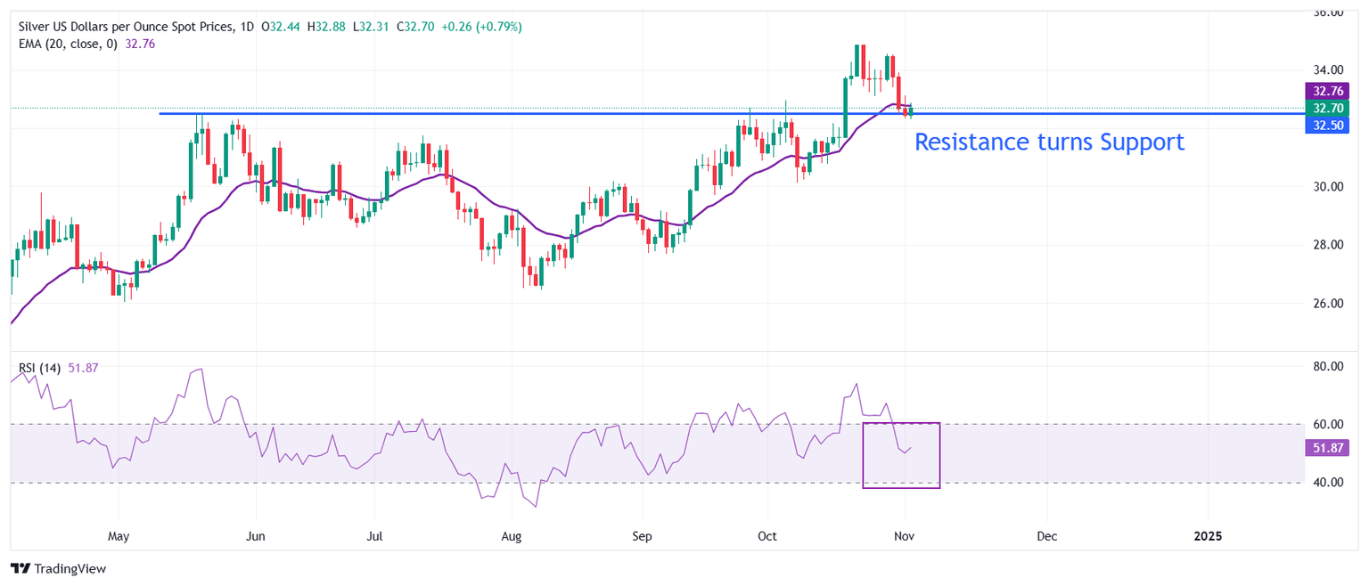 Silver price discovers strong buying interest near the key horizontal support plotted from the May 20 high of $32.50 on a daily timeframe, which acted as resistance earlier. The white metal finds a temporary cushion near the 20-day Exponential Moving Average (EMA), which trades at around $32.80.