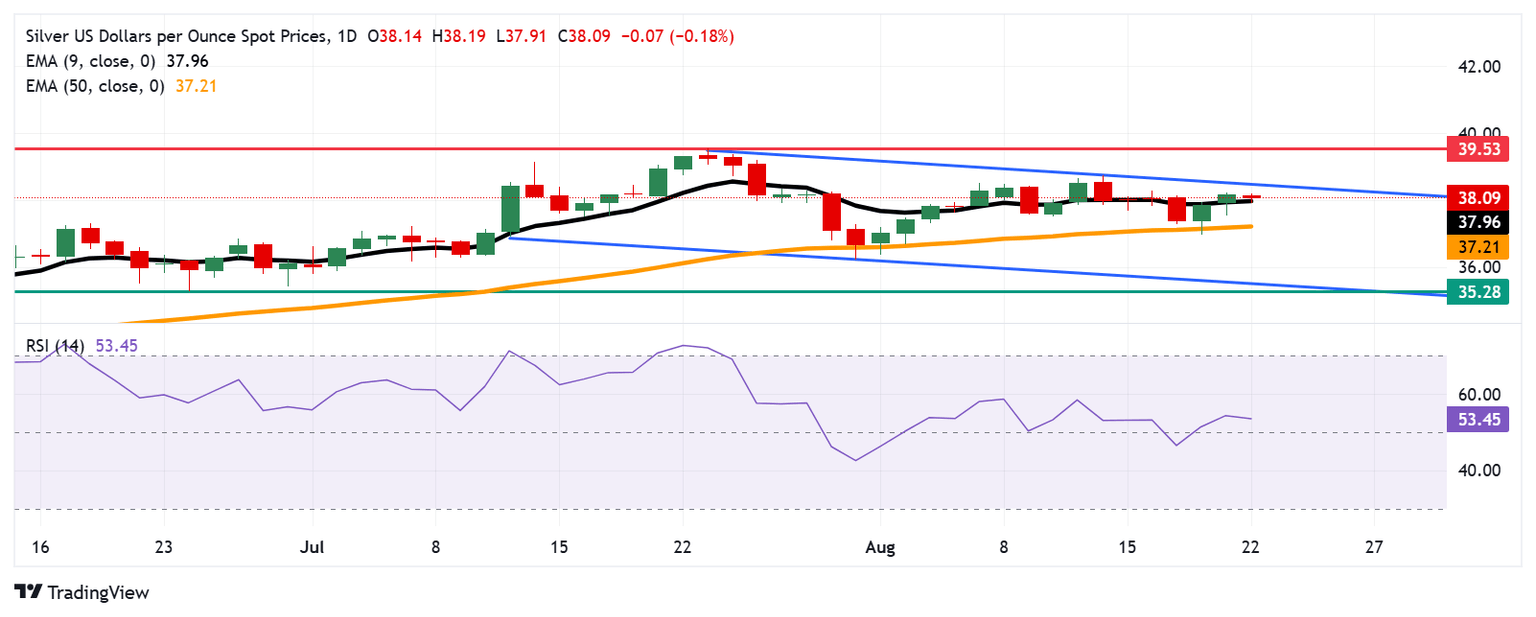 Silver price (XAG/USD) depreciates after two days of gains, trading around $38.10 per troy ounce during the European hours on Friday. The technical analysis of the daily chart suggests the price of the precious metal remains within a descending channel pattern, indicating a bearish bias is active.