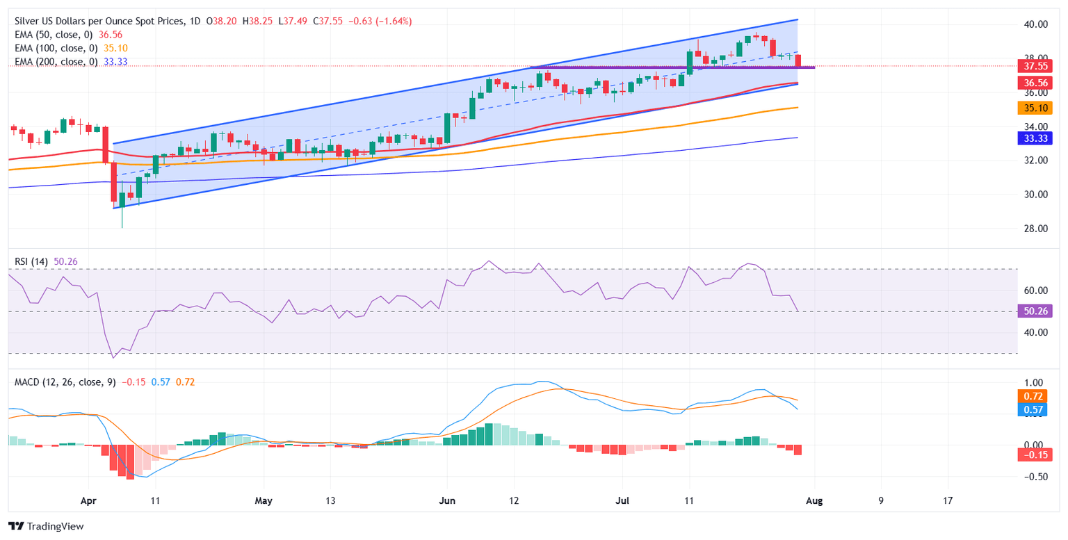 - Silver extends decline, hovers near $37.50 after hitting a 14-year high of $39.53 on July 23.