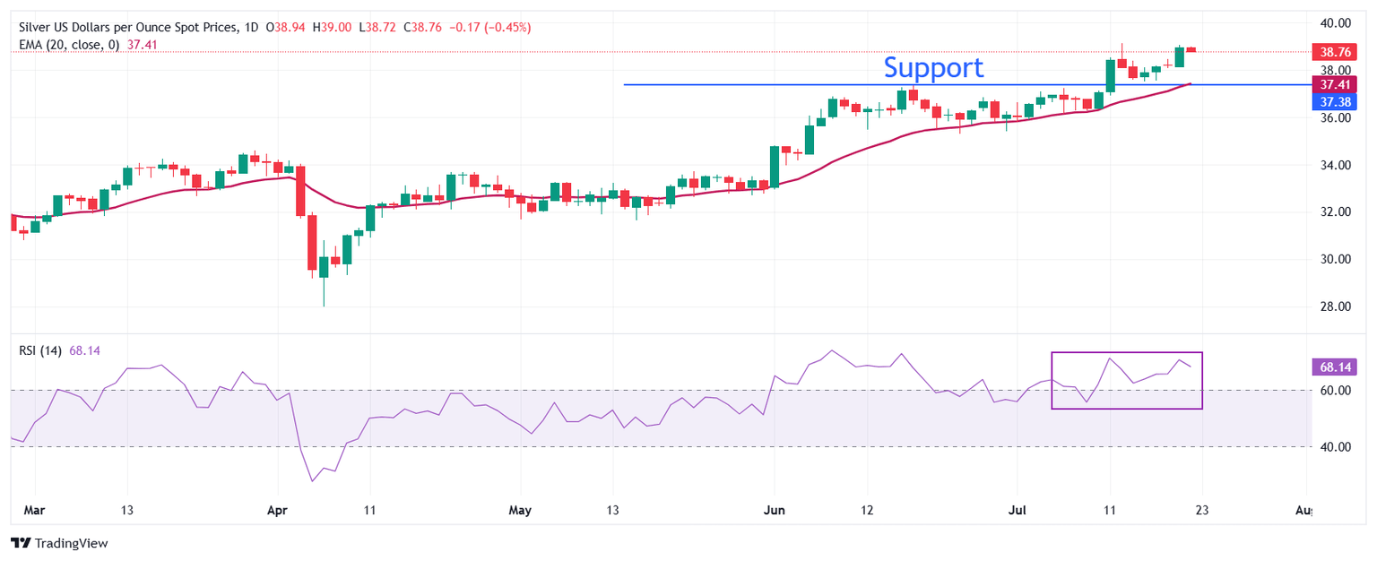 Silver price trades broadly stable near its decadal high around $39.00. Upward-sloping 20-day Exponential Moving Average (EMA) near $37.40 suggests that the near-term trend is bullish.
