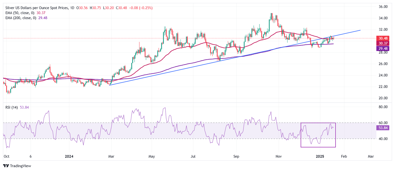 Silver price struggles near the upward-sloping trendline around $30.80, which is plotted from 29 February 2024 low of $22.30 on a daily timeframe.