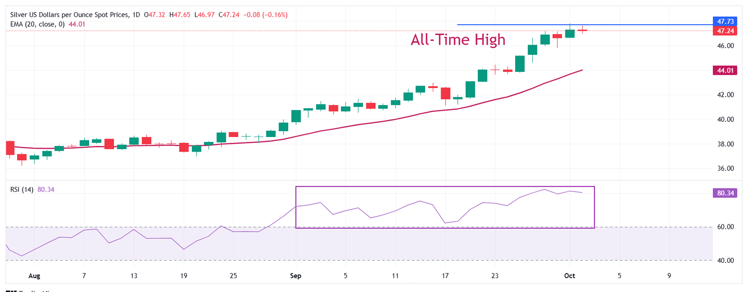 Silver price (XAG/USD) holds onto gains near the all-time high around $47.80 during the Asian trading session on Thursday. The white metal posted a fresh all-time high on Wednesday as funding to the United States (US) government stopped after the short-term funding bill failed to achieve a majority in the House of Senate on Tuesday.