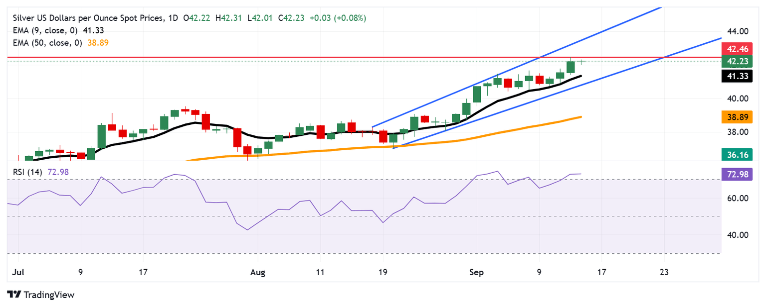 Silver price (XAG/USD) maintains its position after registering more than 1.5% gains in the previous session, trading around $42.20 per troy ounce during the European hours on Monday. The technical analysis of the daily chart suggests the price of the precious metal moves upwards within an ascending channel pattern, indicating that market bias is bullish.