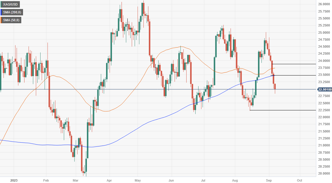 Silver price plunged 0.83%, although US Treasury bond yields paused their uptrend after data from the United States (US) sponsored speculations the US Federal Reserve is not done raising interest rates. Despite this, the Greenback (USD) is rising a headwind for the white metal. The XAG/USD is trading at $22.97 per troy ounce after hitting a daily high of $23.18.