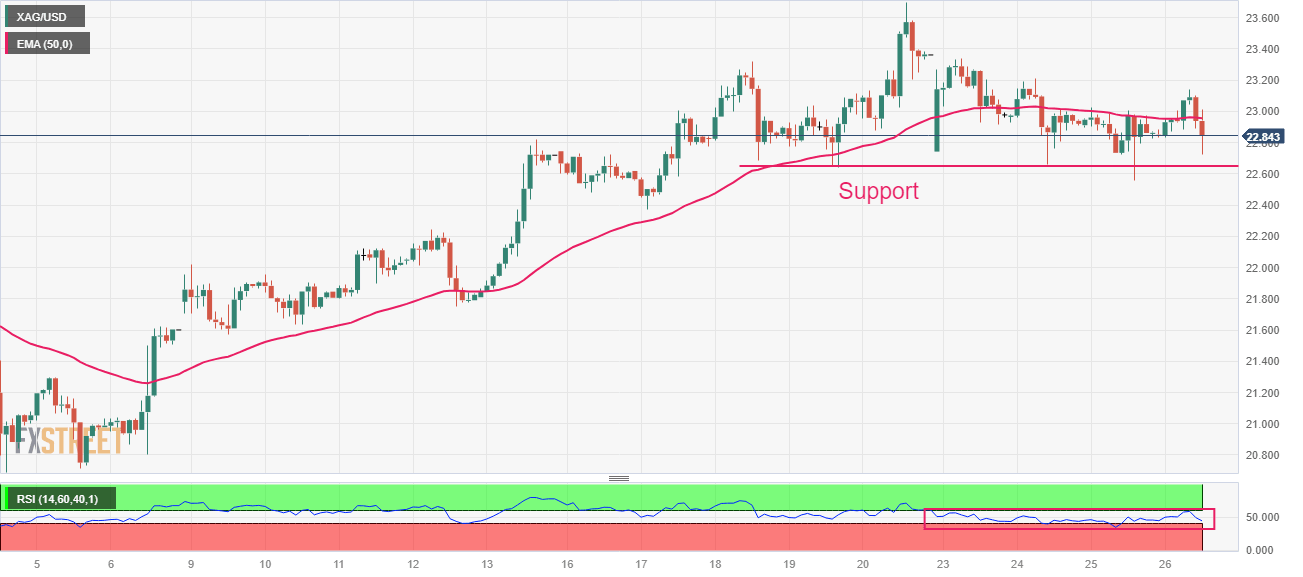 Silver price consolidates near the horizontal support plotted from October 19 low at $22.65 on a two-hour scale. The 50-period Exponential Moving Average (EMA) around $23.00 remains sticky to the Silver price, indicating a sideways performance. The Relative Strength Index (RSI) (14) oscillates in the 40.00-60.00 range, which indicates that investors await a potential trigger.