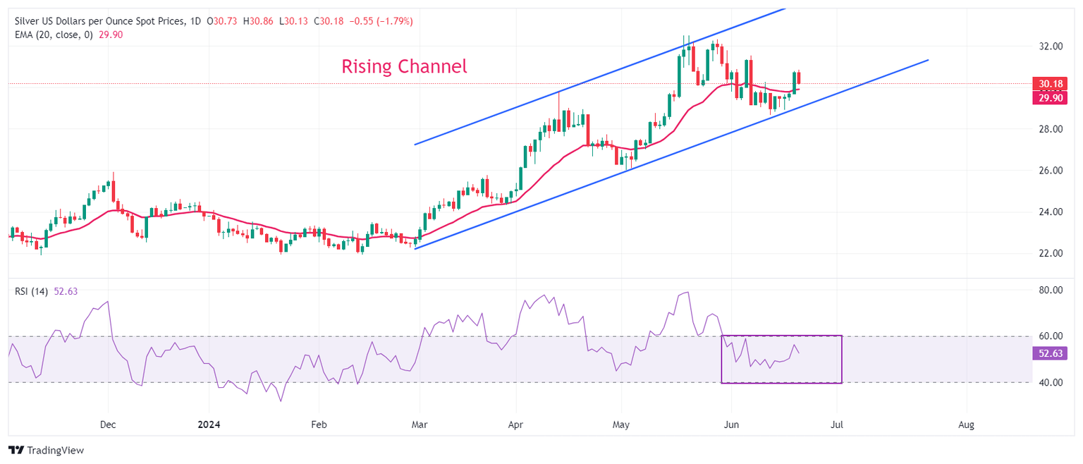 Silver price rebounds after discovering buying interest near the lower border of the Rising Channel chart pattern formed on a daily timeframe. The white metal rises above the 20-day Exponential Moving Average (EMA) near $29.90, suggesting that the near-term trend has turned bullish.