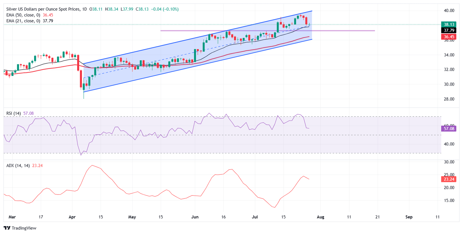 Following Friday's decline of more than 2.0%, the spot price has dipped below the 50-period Exponential Moving Average (EMA), which stands around $38.49, and is now testing the 100-period EMA near $38.03. Momentum indicators are also backing the downside pressure. The Relative Strength Index (RSI) currently sits at 32.00, just above the oversold territory, while the Average Directional Index (ADX) has climbed to 36.86, indicating strong directional momentum favoring further downside. Immediate support lies at the psychological $38.00 level, followed by the July 16 low at $37.50, a key level to watch for potential breakdown or bounce.