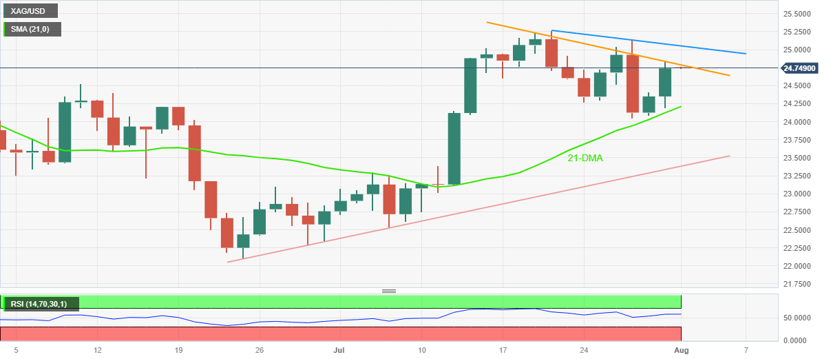 That said, a fortnight-old descending resistance line challenge the Silver bulls near $24.80, a break of which could test a downward-sloping trend line from July 20, close to $25.05 by the press time.