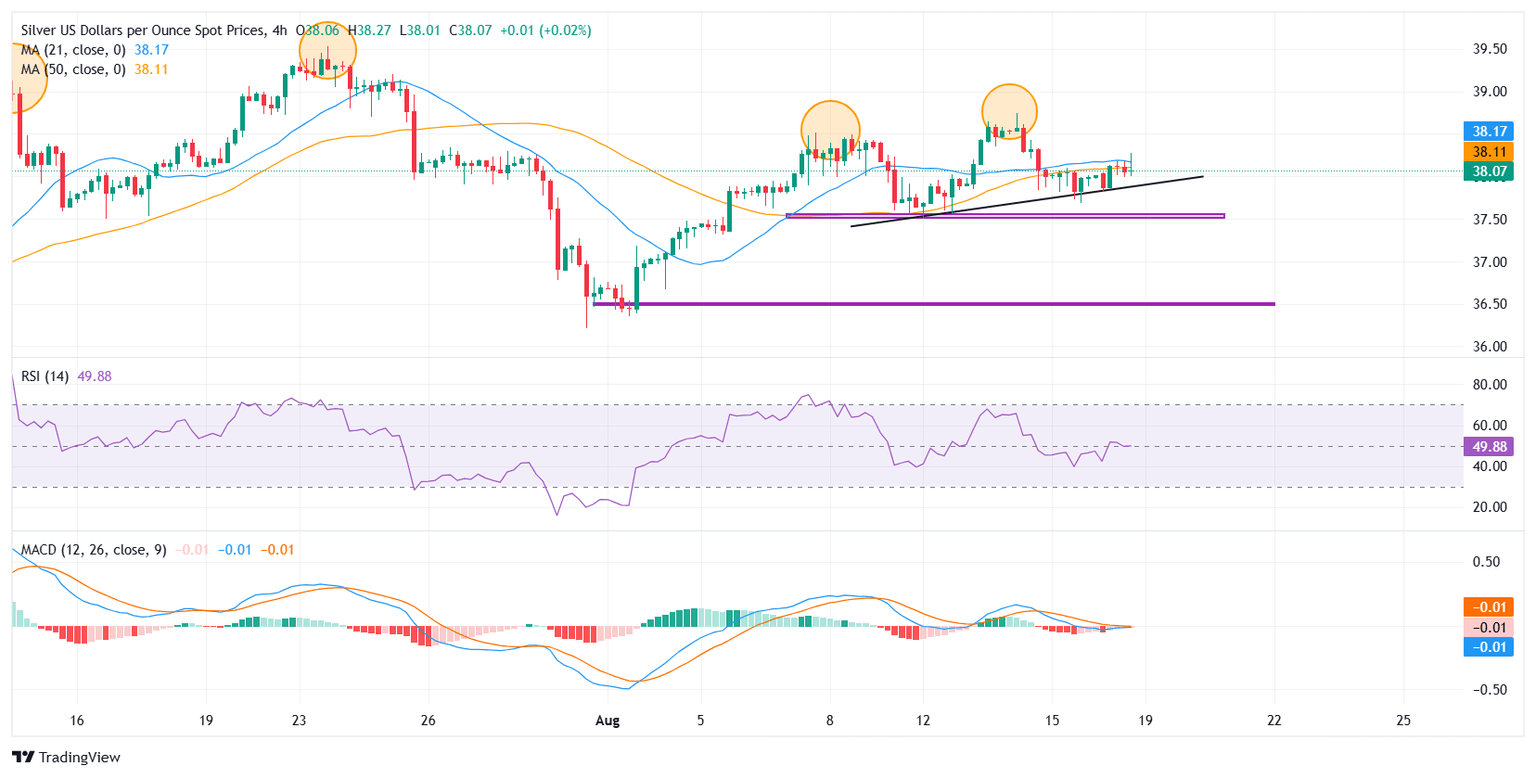 - Silver remains range-bound below $38.50, with a double-top pattern and converging moving averages signaling fading momentum.