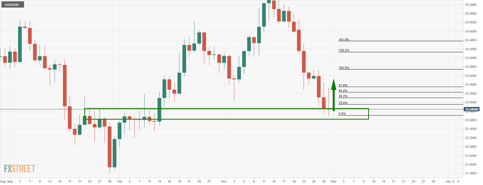 The price of silver was a touch lower on the day despite a strong rally in the US dollar. Equities sold off and bond yields lifted as Fed Chair Jerome Powell indicated the Fed might consider accelerating the taper of bond purchases as inflation persists. At the time of writing, the white metal is down some 0.33% after falling from a high of $23.312 to a low of $22.6935.