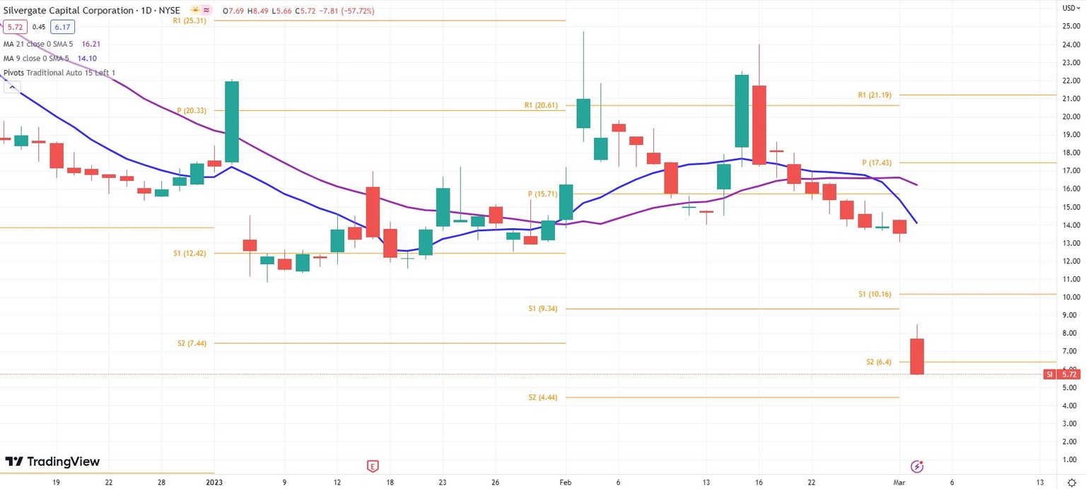 $5.51 is a long distance from Silvergate Capital stock's all-time high in November 2021 of $202.59. My, how times have changed. SI stock is now more than 97% off those highs. The "going concern" talk should keep any potential knife catchers away from Silvergate. If, however, you want to take your chances, instead just look at the daily chart below. On Thursday Silvergate shares plunged through the S2 daily pivot level of $6.40. The reason you cannot see the S3 pivot below is that it is at $-0.87. That's right. The support given by the pivot points is literally less than zero. This is not a stock to own. The chart is clear.