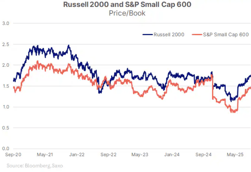 - Price-to-book (P/B): On a 1-year forward basis, the Russell 2000 sits around 1.75 versus 1.48 for the S&P 600. Both are cheaper than large caps, but again the S&P 600 looks more reasonable when quality is factored in.