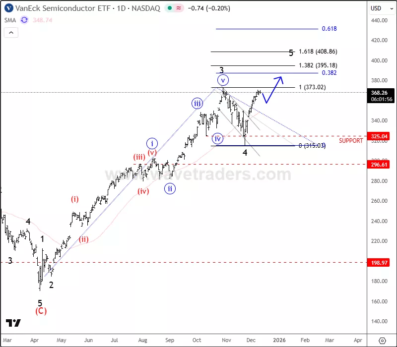 VanEck Semiconductor ETF (SMH) is trading within a five-wave bullish impulse from the April lows. Based on Elliott Wave theory, the ETF appears to be in the final Wave 5, which can still extend above the October highs toward the 400 area. Short-term pullbacks are possible, but the broader trend remains bullish. With current risk-on sentiment, semiconductor stocks could continue higher into late 2025 or even early 2026.