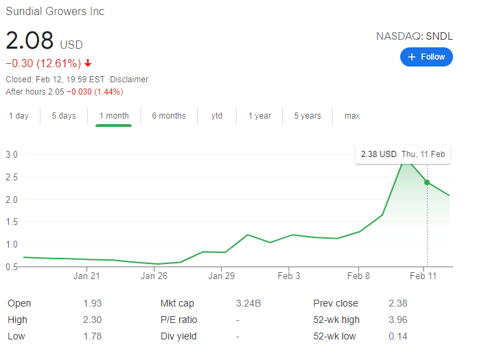 Update: Shares in SNDL are sharply lower on Wednesday as investors digest Tuesday's Indiva announcement. SNDL shares are currently trading at $1.85 a loss of 15%. Sundial shares had peaked near $4 on Feb 11 as strong retail buying bosted the shares of most cannabis stocks.