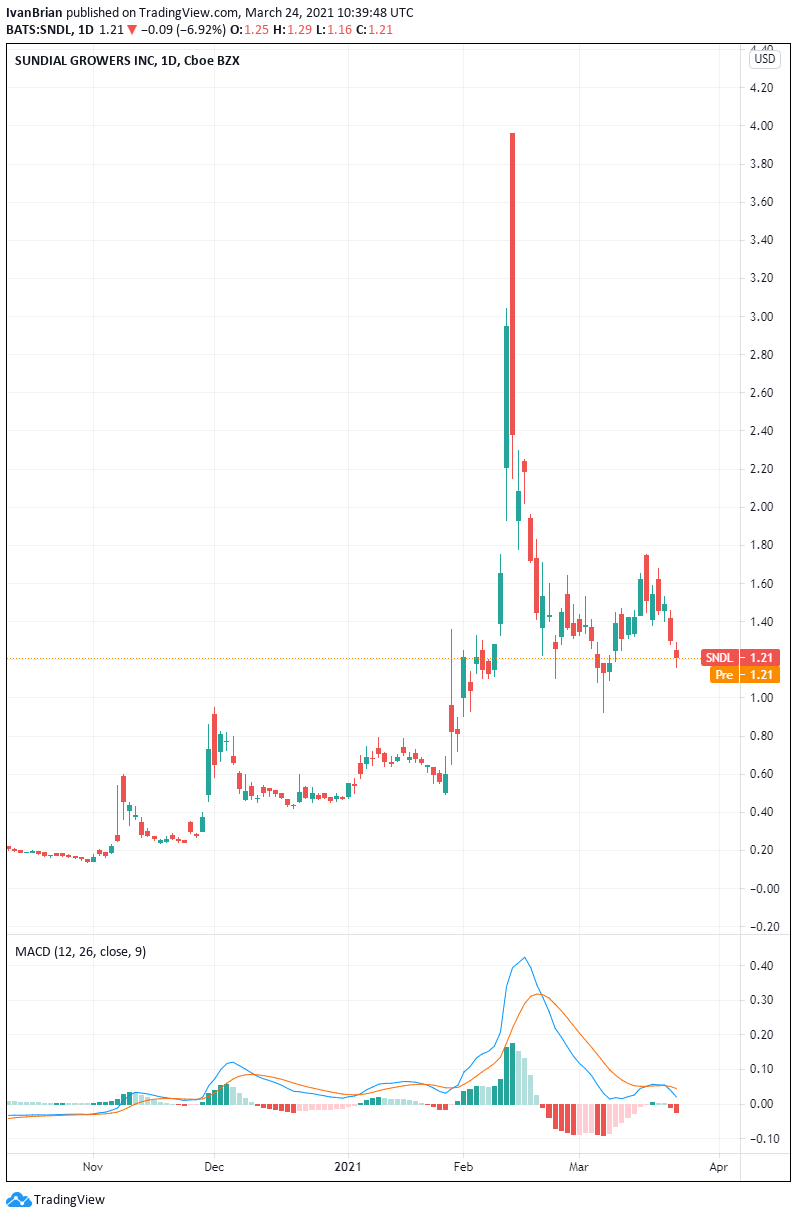 Sundial closed out December 2020 at sub $0.50 but by mid-February had reached nearly $4. It may be nice to get high, but this was too much, man! SNDL shares have retreated to sub $2 for most of March, trading in the $1.20-$1.80 range.