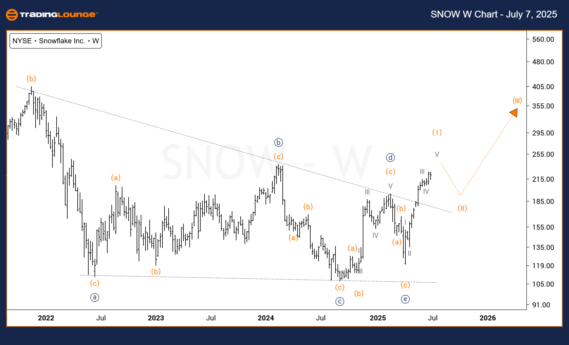 On the weekly chart, SNOW is advancing in a strong impulsive trend within a broader bullish framework. Wave (I) has already completed following a breakout from a consolidation triangle. Currently, the market is moving through Wave (II), and once this corrective leg ends, a strong Wave (III) is anticipated. Wave (III) typically carries significant momentum, representing a key opportunity. Traders should observe resistance and potential consolidation areas before the upward continuation resumes.