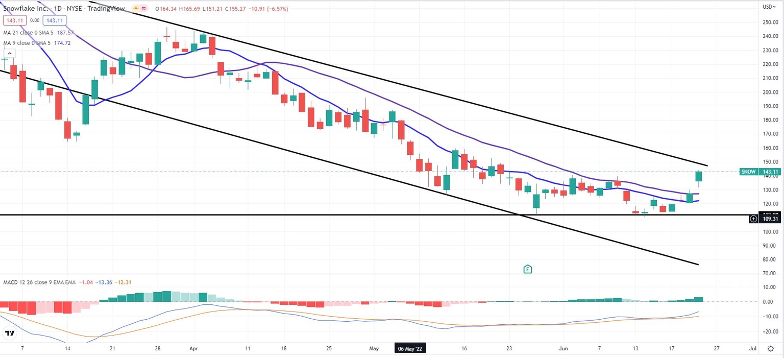 SNOW stock is now trading up near the top line of its descending price channel. If the market continue to be as optimistic as it has been of late, we think Snowflake stock may overtake the descending top line, which began back in November 2021. At present the top line is at or just below $150. A close above $150 will signal that the rally should continue. A bounce down off the top line may instead signal that SNOW needs to find more support and build a base.
