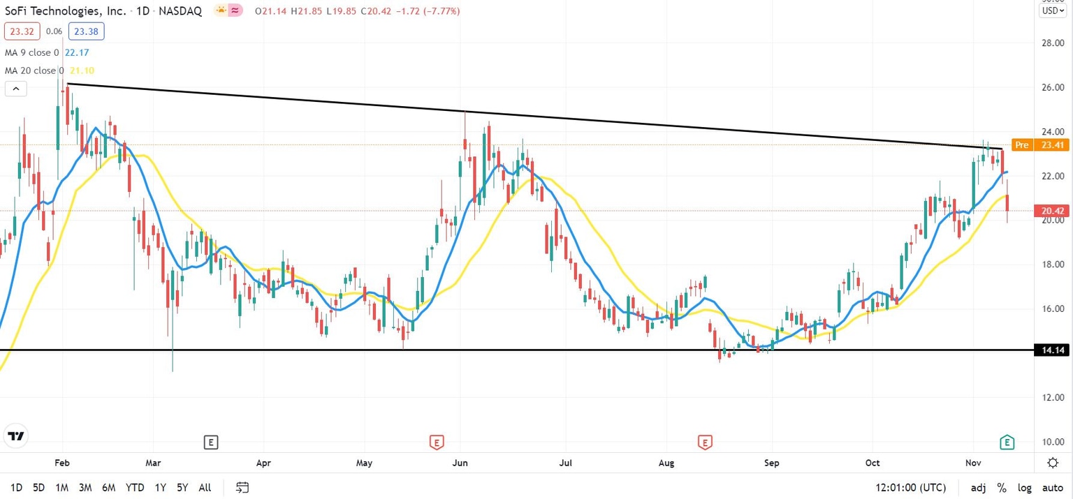 SOFI chart: Technicals require breaking above $23.63 to retain uptrend