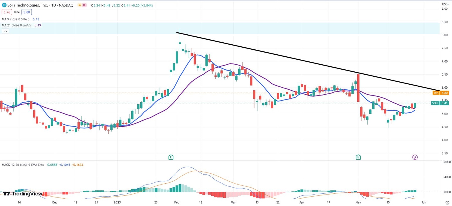 SOFI bulls will need to overtake that descending trendline to provoke a larger rally. The top trendline currently sits at $6.10. Then there is the May 1 resistance point at $6.50, a level that served as support back at the start of the year. Recent support at $4.50 will need to work again if that trendline is not overtaken soon.