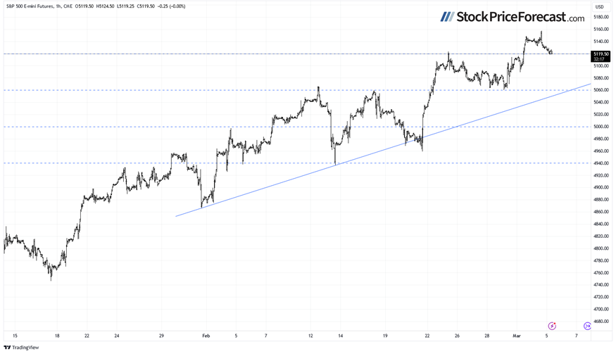 Let’s take a look at the hourly chart of the S&P 500 futures contract. On Friday, it reached a new record high of around 5,149, and yesterday, it’s dipped to the support level of 5,100-5,120. This morning, it’s trading along the 5,120 level. For now, it looks like a short-term consolidation following last week’s advance.
