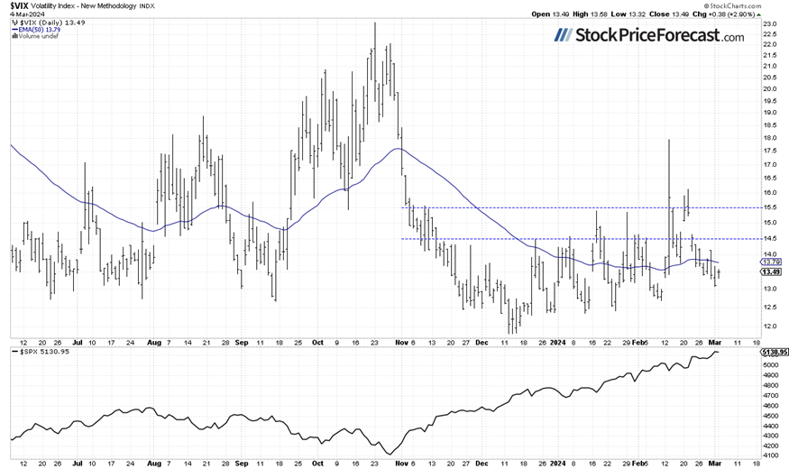 Stocks didn’t change much on Monday, and the market was much calmer than on Friday, when the S&P 500 index broke above the 5,100 level. Yesterday, it lost 0.12% after reaching a new record high of 5,149.67. On Friday, I mentioned February, “Despite concerns about stock valuations, the market rallied to new record highs, fueled by hopes of the Fed's monetary policy pivot and the AI revolution.”. And yet, it was the same story again on the first trading day of March. However, on Monday, some profit-taking emerged.