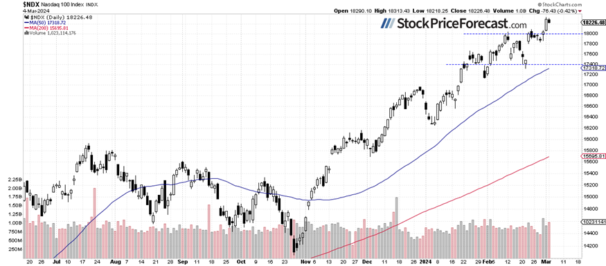 The recent trading action was very bullish, with some of the tech stocks rallying to new record highs, the S&P 500 index breaking above 5,100, and the Nasdaq 100 index reaching above the 18,000 mark. In my February 13 analysis, I noted that, “in the short term, the possibility of a downward correction cannot be overlooked. A quick glance at the chart reveals that the S&P 500 index has recently become more volatile.”. Indeed, the correction occurred pretty fast, with the inflation number contributing to the downturn. However, the market quickly retraced the decline in the following days, and then rallied, led by Nvidia stock after its earnings release.