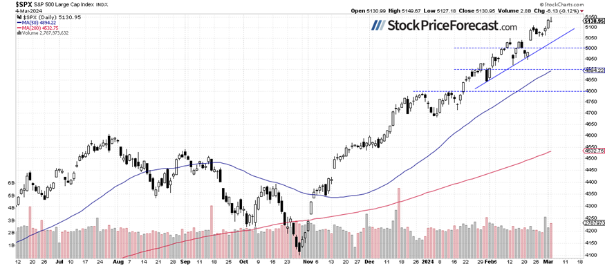 On Friday, I noted in my Stock Price Forecast for March, “So far, stock prices have been trending upwards in the medium to long term, reaching new record highs. The prudent advice one could give right now is to remain bullish or stay on the sidelines if one believes stocks are becoming overvalued and may need a correction. It's likely that the S&P 500 will continue its bull run this month. However, we may encounter a correction or increased volatility at some point as investors start to take profits off the table.”