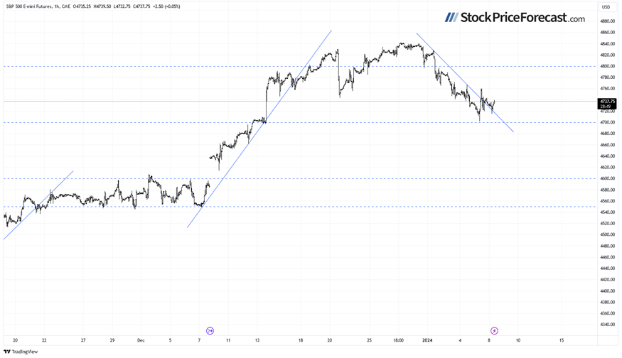 Stocks are expected to open virtually flat today, and the S&P 500 index will extend a short-term consolidation along the 4,700 level. The market may be forming a short-term bottom here, but it’s hard to say whether it will resume its medium-term uptrend or simply trade within a consolidation following November-December rally.