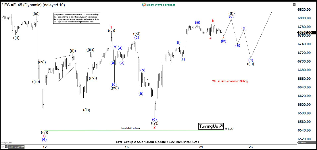 The short-term Elliott Wave analysis for the S&P 500 E-Mini Futures (ES) indicates the Index is currently in the final leg of wave (5), originating from the April 2025 low, before a larger three-wave correction unfolds. The decline to 6540.5 marked the completion of wave (4), followed by an upward turn in wave (5), structured as an impulse Elliott Wave pattern. From the wave (4) low, wave ((i)) concluded at 6718.5, with a subsequent pullback in wave ((ii)) ending at 6593.25. The rally in wave ((iii)) peaked at 6722.5, followed by a dip in wave ((iv)) to 6666. The final wave ((v)) reached 6766.75, completing wave 1 in a higher degree.