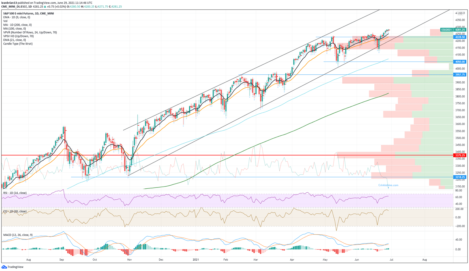 We use the E-mini futures contract (ES) for our analysis as it is the most traded S&P proxy, closely followed by the S&P 500 Exchange Traded Fund (ETF), the SPY. The strong uptrend remains firmly in place, and the channel is really the only meaningful resistance. Based on the average length of time the S&P has taken to move from the bottom to the top of this channel, we are looking at above 4,550 as resistance sometime in early August. So just another 10% then. Seems a bit optimistic to be writing that, but such is the equity market we currently reside in. The trend is your friend, as the old adage goes, and this one is strong. Over in Nasdaq world, the Relative Strength Index (RSI) has drifted into overbought territory, so keep an eye on this. Note though that an overbought reading can be returned to neutral with some sideways consolidation price action. It does not mean a sell-off to correct. But the move may be slowing or stalling. 4,228 is the short-term support and close to the 21-day moving average. This means a buy-the-dip strategy with a tight stop may work. Personally, I would rather wait for a pullback to somewhere along the trend line at 4,200. A break of that brings the move outside the channel and toward strong support in a more medium to long time frame at 4,050. This really needs to hold as a break will likely accelerate due to volume dropping off, see the volume profile on the right side of the chart.