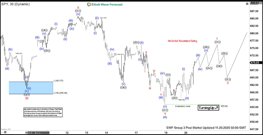 The bullish cycle in the S&P 500 ETF (SPY), which commenced from the April 7, 2025 low, remains underway as a five-wave impulsive structure. Wave (3) of this advance concluded at the October 29 high of $689.70. Subsequently, the corrective phase in wave (4) unfolded as a double three Elliott Wave pattern, as illustrated in the 30-minute chart.