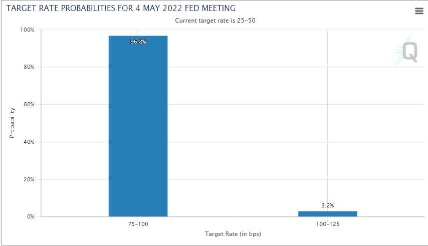 The main US equity indices struggled for direction on Tuesday as investors largely stayed on the sidelines before the Federal Reserve raises interest rates on Wednesday. The Fed is expected by all to raise rates by 50 bps when it meets this evening. Market have largely priced in this hike and are pricing in 3 more aggressive 50 bps rate hikes this year. Any deviation from Jerome Powell and the FOMC in its press conference will see markets whipsaw violently as investors reposition.