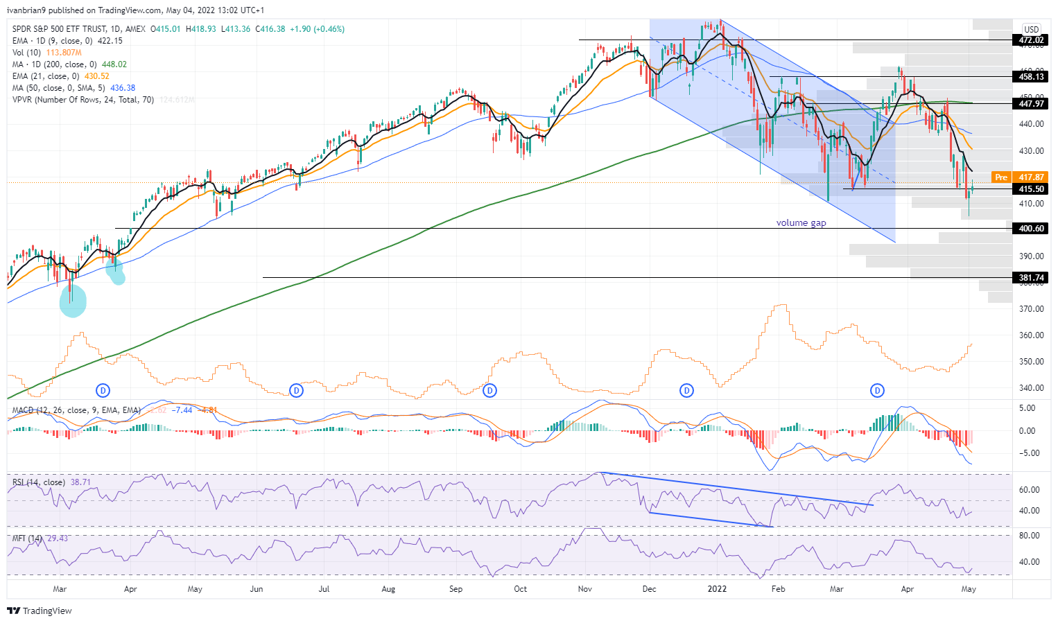 This is just a feeling not based on technical evidence, but the SPY has already put in a lower low to confirm the 2022 bearish trend. Above $420 we would expect the rally to continue to test resistance at $448.
