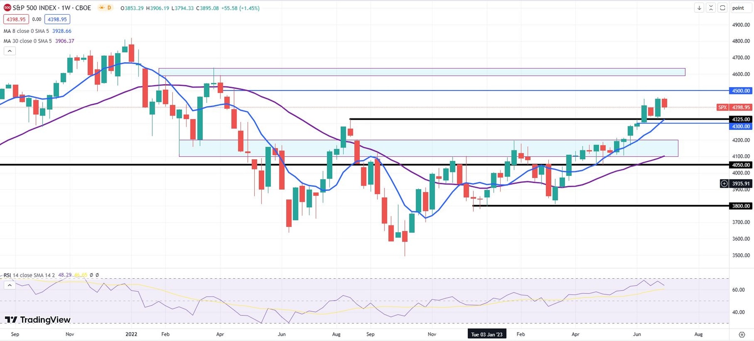 If this meager buying environment persists, then expect the S&P 500 to charge back to support at 4,300 or 4,325. That latter level is where the index found support on June 26. Medium and longer-term support are at 4,100 and 3,800, respectively.