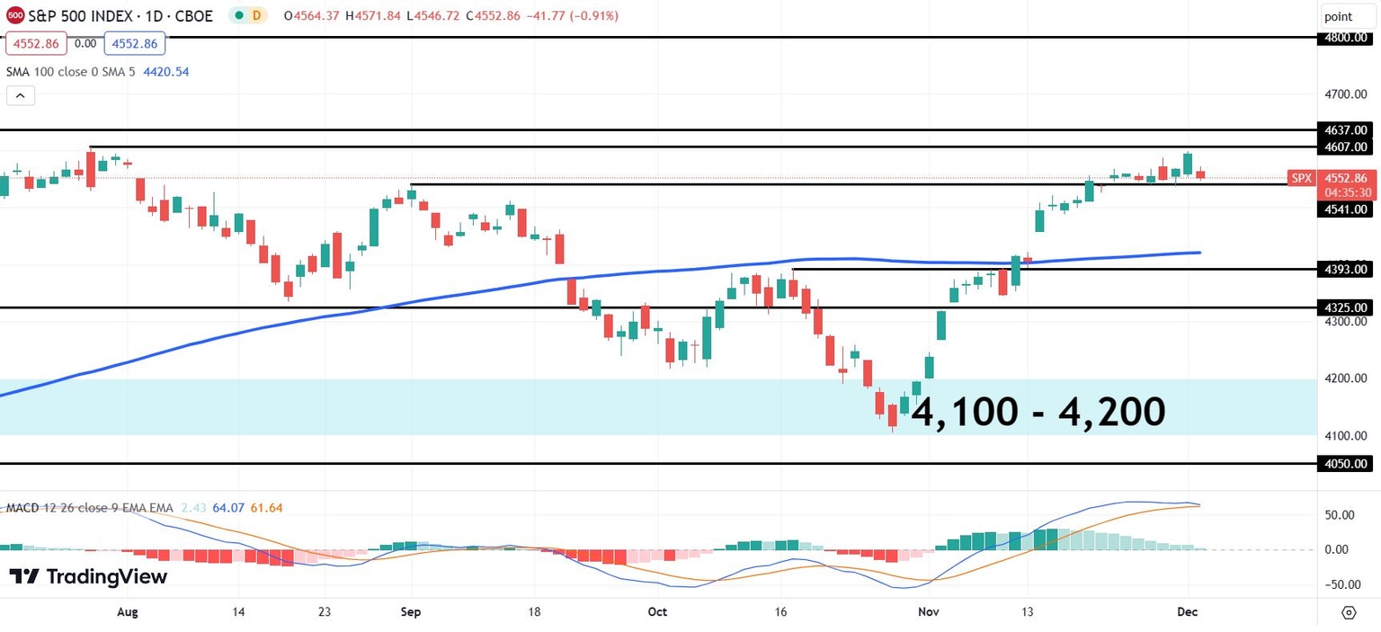 In November the S&P 500 blew right through the 4,541 resistance point stemming from the lower high on September 1. However, there are two other historical resistance levels in close succession. These are the July 27 annual high at 4,607 and then the 4,607 level from March 2022. Both of these resistance levels must be overcome in order to reach the 4,800 all-time high from December 2021.