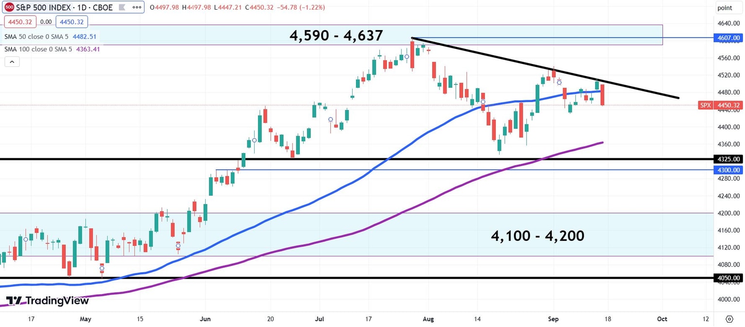The S&P 500 index appears to be in a downtrend since reaching 4,607 on July 27. A top trendline (black) since then shows that the index has sold off on two occasions since retouching that descending trendline – September 1 and September 14.