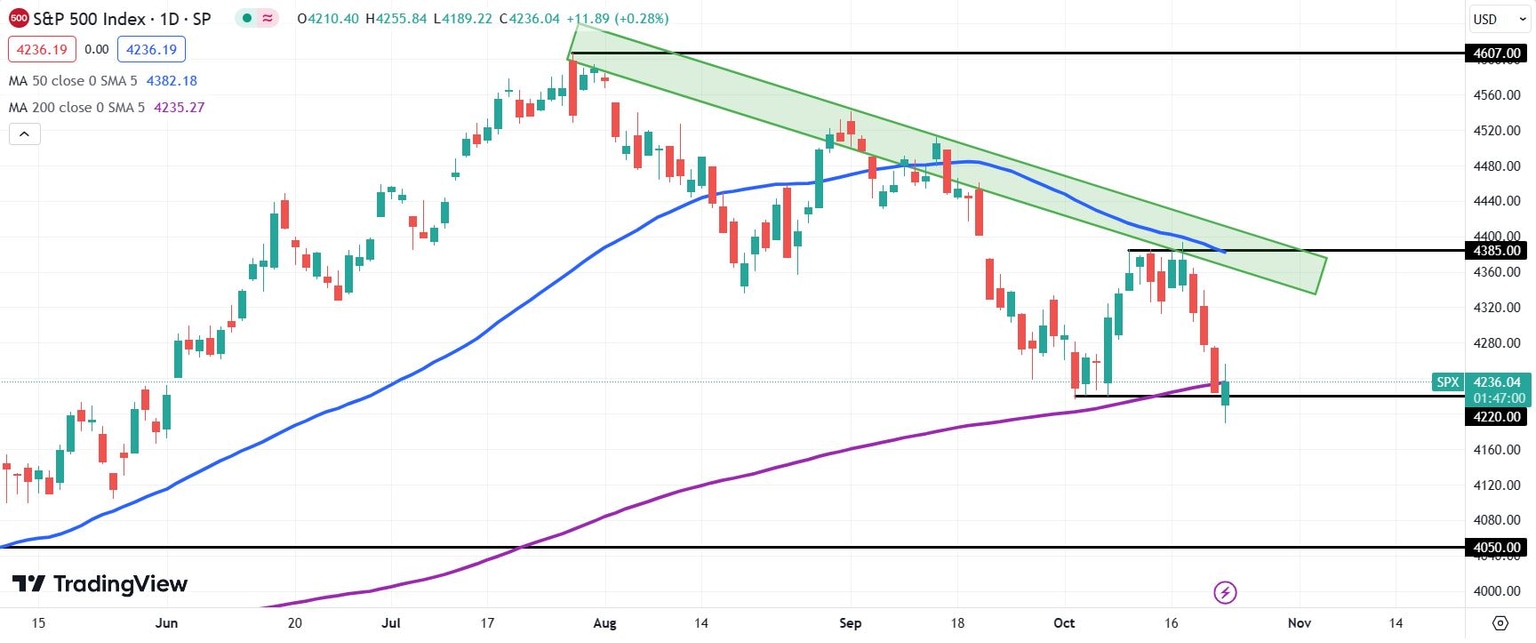 It is best to trust the gut on this one. If the index broke below the 4,200 barrier on Monday, then it is probably going to continue its downward trajectory. The worry is that there isn’t much support until 4,050 – another 4% lower.
