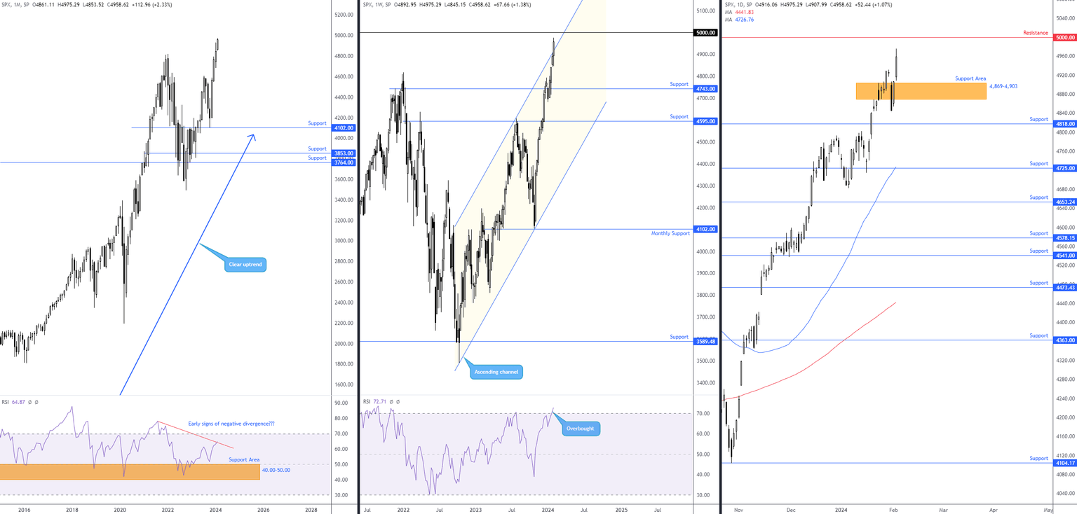 January ended in unchartered territory, touching a fresh all-time high of 4,931 and adding +1.6%. This extended recovery gains from the near-test of monthly support coming in from 4,102 in October 2023. Recent posts by the FP Markets Research Team communicated that the index has been entrenched in a dominant uptrend since breaking out in early 2013, and aside from two sizeable corrections in 2020 and 2022, the uptrend has been one-sided.