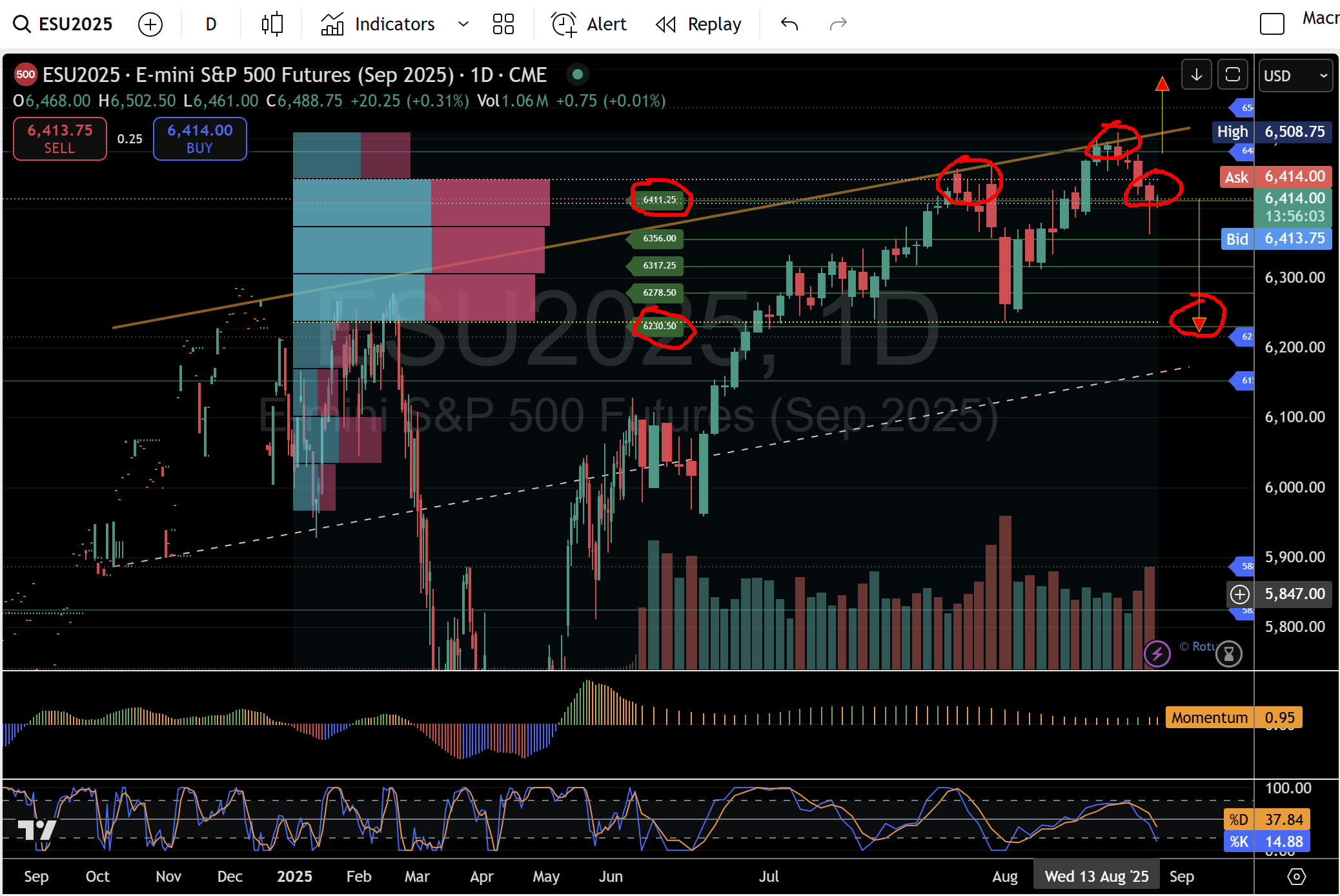 - Overlaying micro grid shows micro-5 (≈6,411) sitting just under 6,481, creating fast rotations back to 6,411 after failed breakouts. Acceptance below 6,411 typically sequences 4→3→2→1—exactly what happened in the July pullback.
